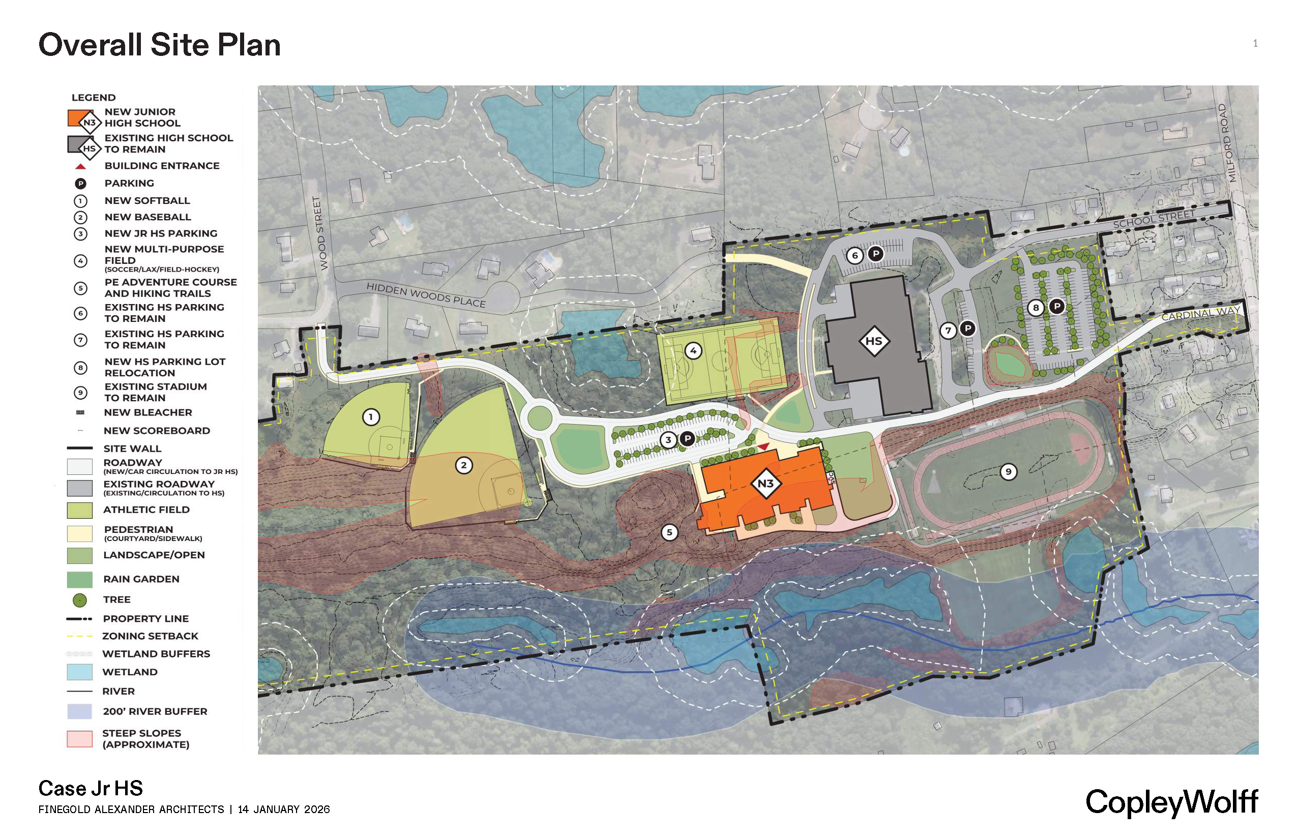 On August 14th, 2025, the School Building Committee took an important step toward the future of Swansea by voting to support the design and engineering of a new Joseph Case Junior High School on the current High School campus. The new building will be located alongside the High School, creating a connected and unified campus for our students. This option not only represents the most cost-effective approach but also best supports our educational vision and plan. Below is an updated schematic of the proposed site from the 1/14/2026 Educational Plan Meeting.